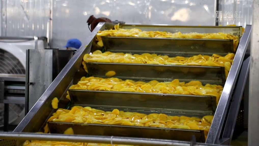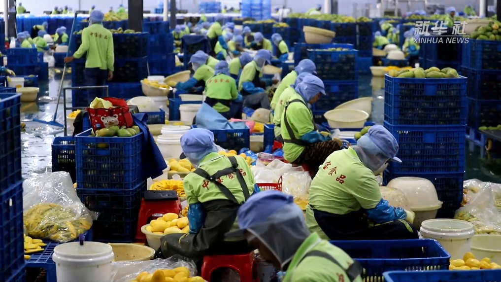中宝(柬埔寨)食品科技有限公司的芒果干加工厂就坐落在磅士卑省尖山县。工厂里,工人们正忙着将刚采摘的鲜芒果卸车、清洗、切削、烘干……最终制成芒果干装箱后通过海运销往中国,十日内便可到达中国商超的货架之上。